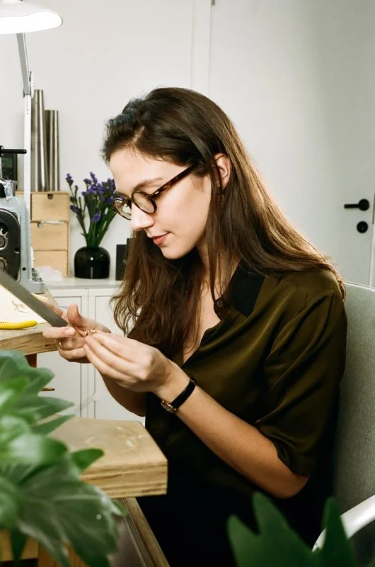 Manon werkt vanuit een persoonlijke en doordachte benadering, waarbij elk juweel ontstaat uit dialoog en aandacht. Ze ontvangt haar klanten in haar atelier, waar ze de tijd neemt om te luisteren naar hun verhaal, ideeën en verwachtingen.